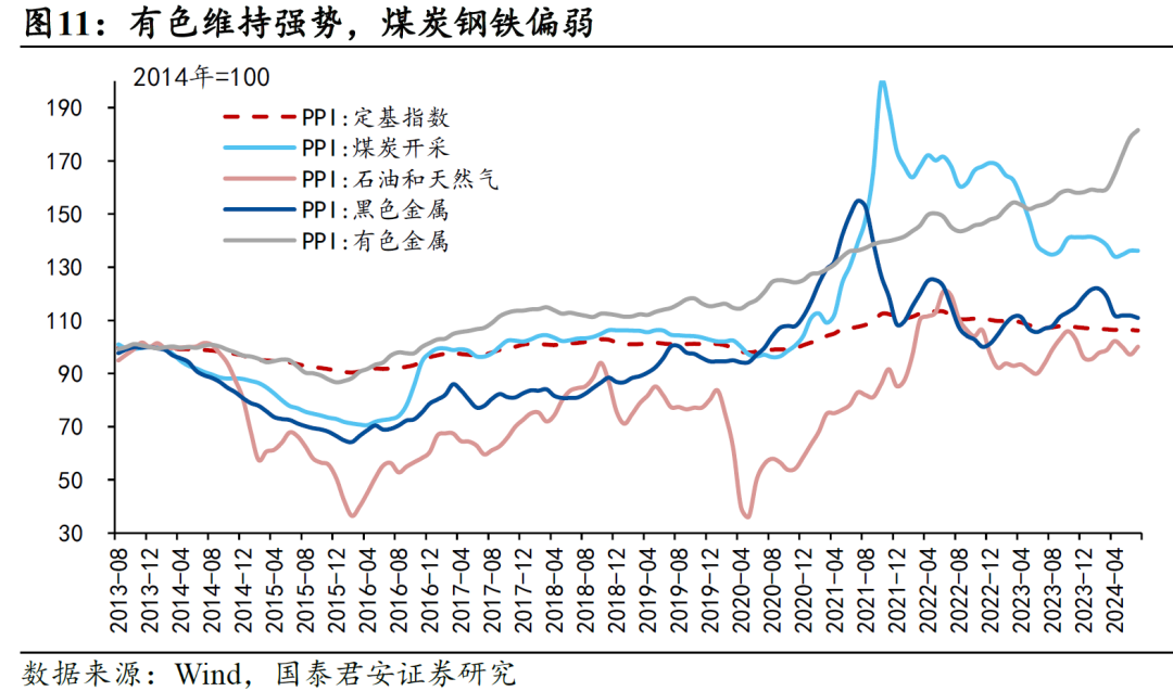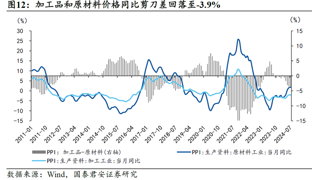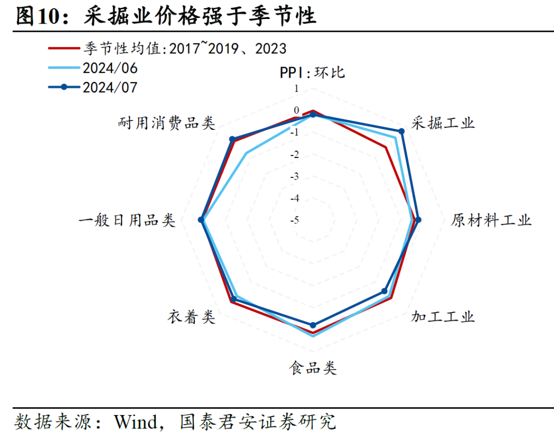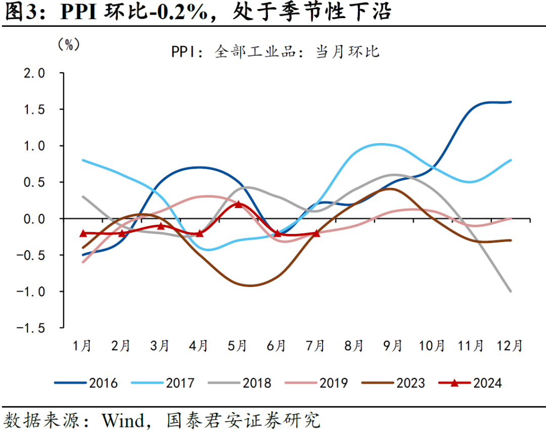 3、PPI:基建投资待回暖,产能过剩须化解。7月PPI同比-0.8%(市场预期-0.8%),环比-0.2%,处于季节性下沿,环比动能没有呈现季节性上涨的特征。