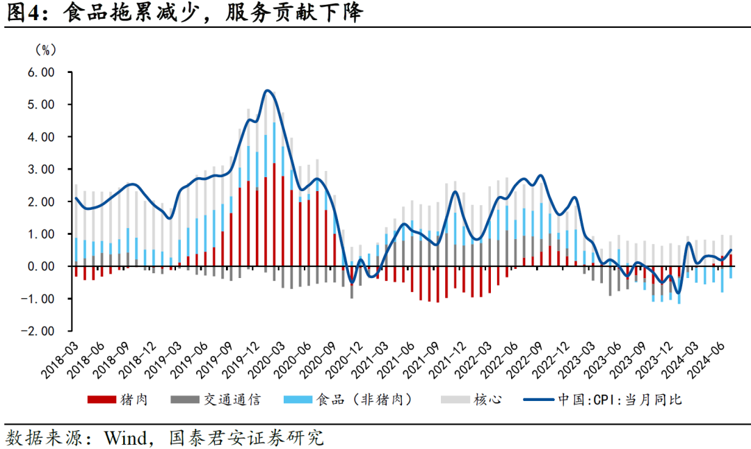 2、CPI:食品拖累减少,但服务贡献下降