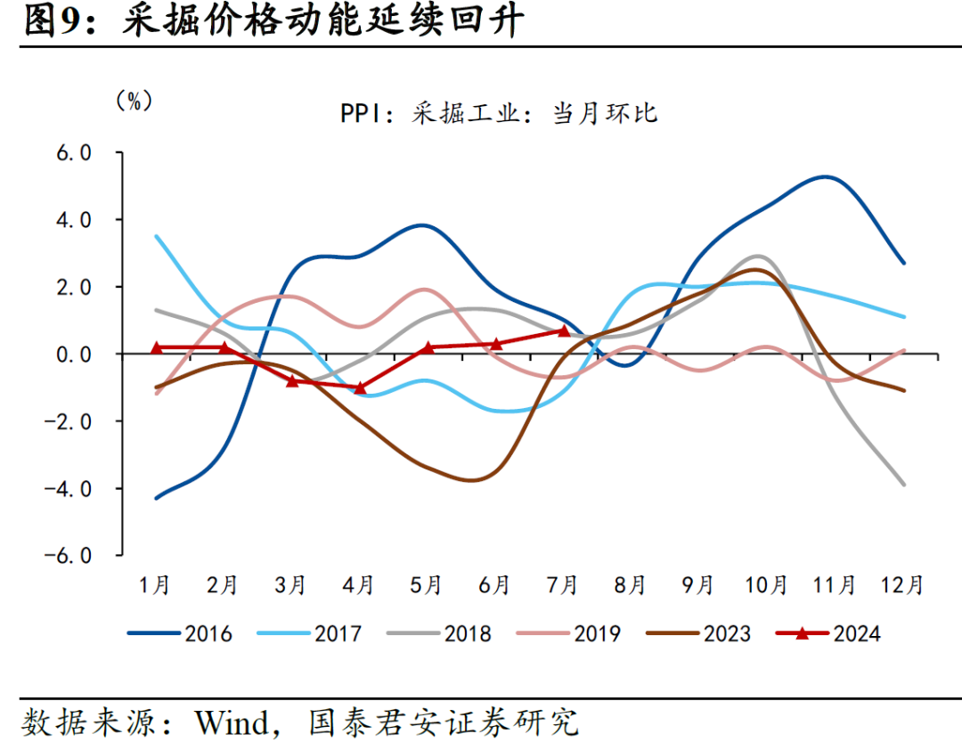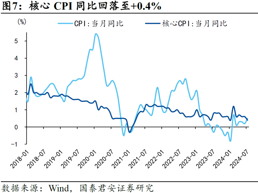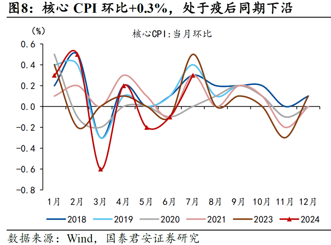 核心CPI内部,7月受极端天气影响,部分热门景区人流量同比下滑,旅游价格环比涨幅不及2023年同期,环比+9.4%,酒店餐饮价格环比+0.9%;消费节结束,日常用品价格回升,家用器具环比+0.4%;毕业租房旺季,房租环比+0.1%;医保目录调整催化药企降价,西药环比-0.2%。综合来看,尽管出行类价格上升,但整体消费意愿不及2023年暑期,7月核心CPI环比+0.3%,低于2023年7月的0.5%,同比回落至0.4%。