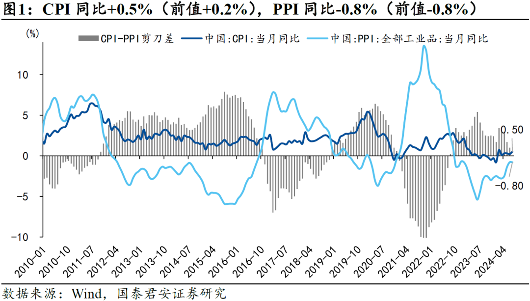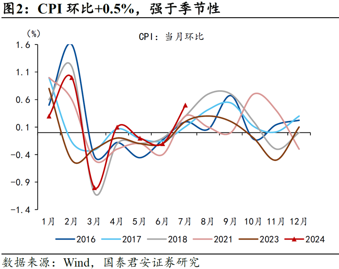 导读]article_adlist-->7月通胀回升主因食品拖累减弱,但我们提示这一条件无法持续,通胀温和回升需要更加坚实的基础,核心CPI动能偏弱,显示居民整体消费意愿仍待修复。]article_adlist-->摘要]article_adlist-->1、7月CPI同比增速+0.5%(市场预期+0.3%),环比+0.5%;PPI同比增速-0.8%(市场预期-0.8%),环比-0.2%。
